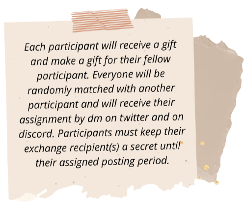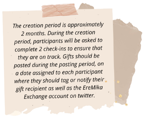 Should this happen, the best thing to do is that participants message the EreMika Exchange account or contact one of the moderators (via twitter ) as soon as possible so the team can assess the situation immediately and organize a backup gift for the dropped out participant’s recipient.